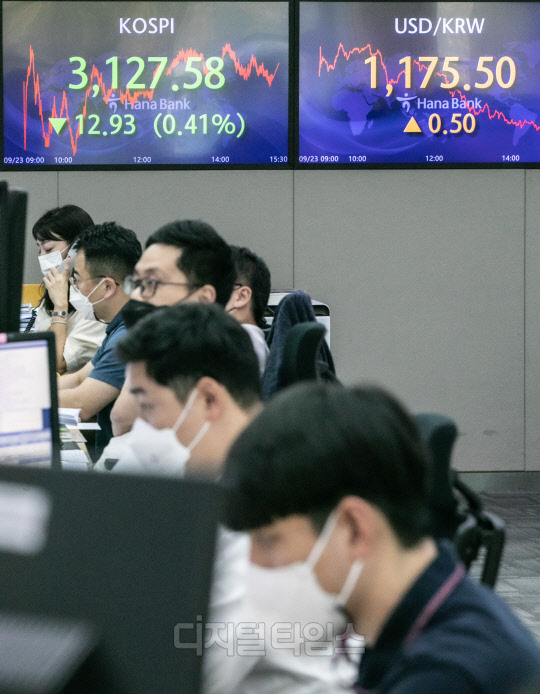 코스피가 전 거래일 대비 12.93포인트 하락한 3127.58로 장을 마친 23일 서울 중구 하나은행 딜링룸에서 직원들이 분주히 업무를 보고 있다. 이날 코스닥은 9.86포인트 하락한 1036.26, 원·달러 환율은 0.5원 상승한 1175.5원으로 마감했다.