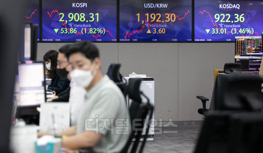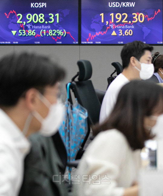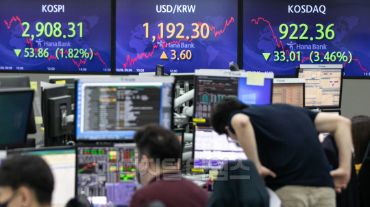 코스피가 전날보다 53.86포인트 급락하며 2,908.31에 마감한 6일 서울 중구 하나은행 딜링룸에서 직원이 분주히 업무를 보고 있다. 이날 코스닥은 33.01포인트 내린 922.36, 원·달러 환율은 3.6원 오른 1192.3원으로 마감했다.