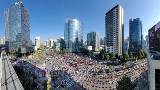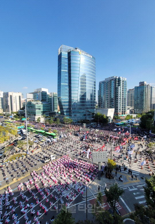 10·20 민주노총 총파업에 참가한 조합원들이 20일 서울 서대문역 네거리에 기습 집결해 도로를 점거한 채 '5인 미만 사업장 차별 철폐·비정규직 철폐, 모든 노동자의 노조활동 권리 쟁취' 등을 주장하며 집회를 하고 있다.