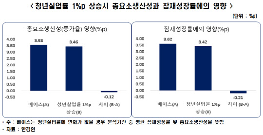 한경연은 1990∼2019년 연간자료를 이용해 실증분석을 해 본 결과, 과거의 청년실업률이 현재의 총요소생산성과 잠재성장률에 유의미한 영향이 있다는 결과를 얻었다.