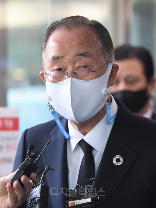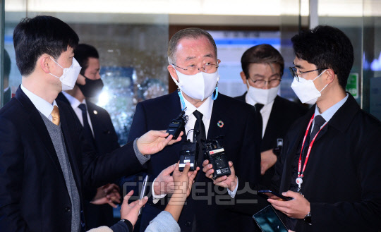 반기문 국가기후환경회의 위원장이 28일 서울 종로구 서울대병원 장례식장에 마련된 고(故) 노태우 전 대통령 빈소를 찾아 조문을 마친 뒤 취재진 질문에 답하고 있다.