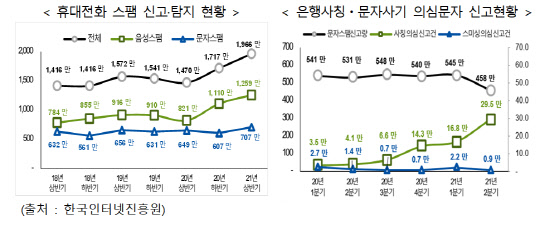 휴대전화 불법스팸 신고·탐지량도 매년 증가 추세다. 지난해 하반기 1717만건에서 올해 상반기 1966만건으로 15% 증가했다. 특히 은행사칭 불법스팸은 올해 1분기 16만건에서 지난 2분기 29만건으로 81% 급증했다.