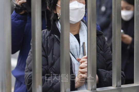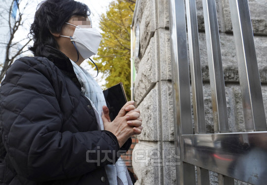 2022학년도 대학수학능력시험이 실시된 18일 서울 영등포구 여의도고등학교에서 한 학부모가 기도를 하고 있다.