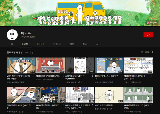 구독자 18만 명을 보유한 채널 '에익쿠'는 MBTI 콘텐츠를 다루는 대표적 채널이다. K-Culture 플랫폼 보이스오브유가 제공하는 인플루언서 랭킹(IMR) 자료에 따르면, 올해 4월 'INFP(인프피)들의 피곤한 인생 모음' 영상을 게재하며 활동을 시작해 4개월만인 지난 8월 구독자 10만 명을 돌파하는 저력을 보였다. 48개 영상에 대한 누적 조회 수는 2천만 회, 영상당 평균 조회 수는 35만 회로 구독자 수를 훌쩍 뛰어넘는다.