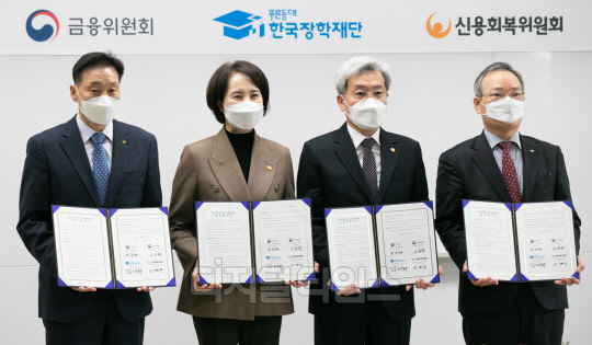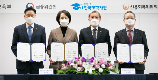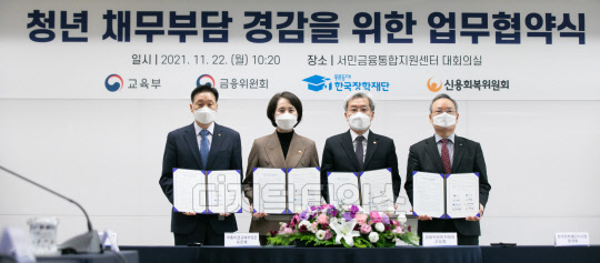 이계문 신용회복위원장(왼쪽부터), 유은혜 사회부총리 겸 교육부 장관, 고승범 금융위원장, 정대화 한국장학재단 이사장이 22일 서울 중구 서민금융통합지원센터에서 열린 청년 채무부담 경감을 위한 업무협약식에서 서명 후 기념촬영을 하고 있다.