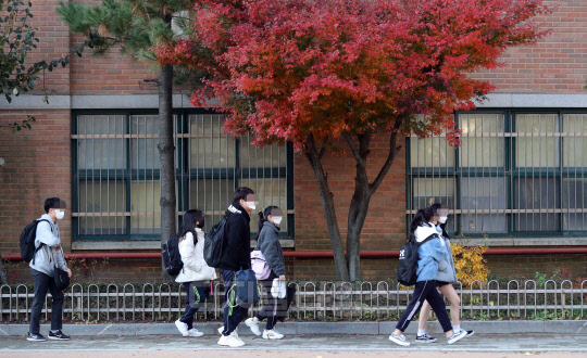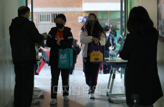 전국 초·중·고교 전면등교가 실시된 22일 오전 서울 강서구 염창중학교에서 학생들이 등교를 하고 있다.