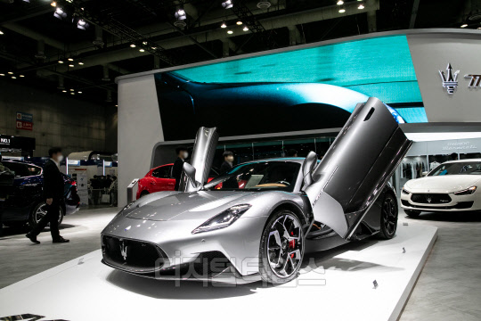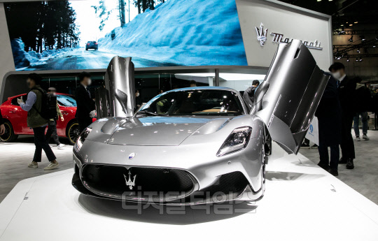26일 경기도 고양시 일산 킨텍스 제2전시장에서 열린 '2021 서울모빌리티쇼'에서 관람객들이 마세라티 MC20 차량을 구경하고 있다.