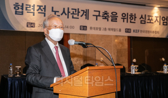 손경식 한국경영자총협회장이 29일 서울 중구 롯데호텔에서 열린 협력적 노사관계 구축을 위한 심포지엄에서 개회사를 하고 있다.
