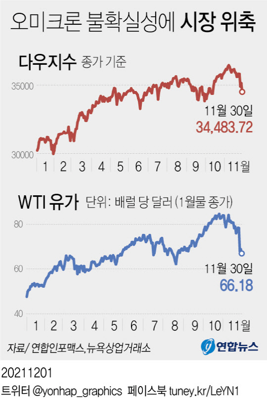 국제유가는 기존 백신이 오미크론에 효과가 없을 수 있다는 가능성이 나오면서 큰 폭으로 떨어지고 있다. 세계 각국이 바이러스 확산을 막기 위해 여행을 제한하거나 각종 봉쇄 조치를 재도입하게 되면 원유 수요가 줄어들 수 있기 때문이다.