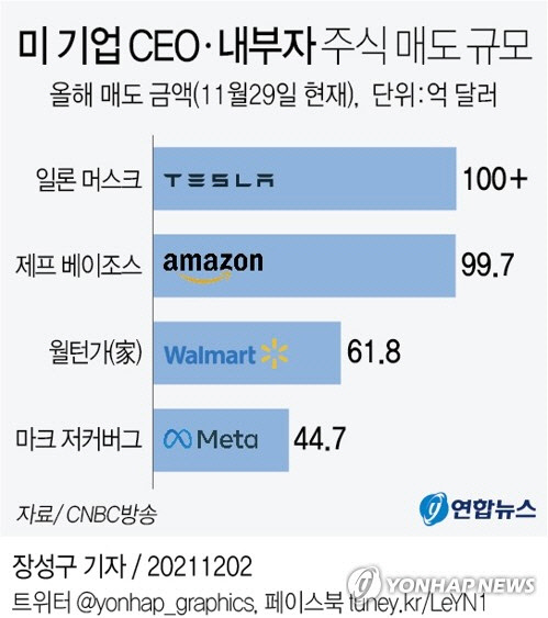 일론 머스크 테슬라 CEO가 테슬라 주식 100억 달러 이상, 제프 베이조스 아마존 창업자가 아마존 주식 99억7000만 달러를 각각 팔아 1, 2위를 차지했다. 월마트를 창업한 월턴가(家)가 61억8000만 달러, 마크 저커버그 메타(옛 페이스북) CEO가 44억7000만 달러를 각각 매도해 그 뒤를 이었다. 1∼4위 '슈퍼 매도자'들이 판 주식이 전체 내부자 매도량의 37%를 차지했다.