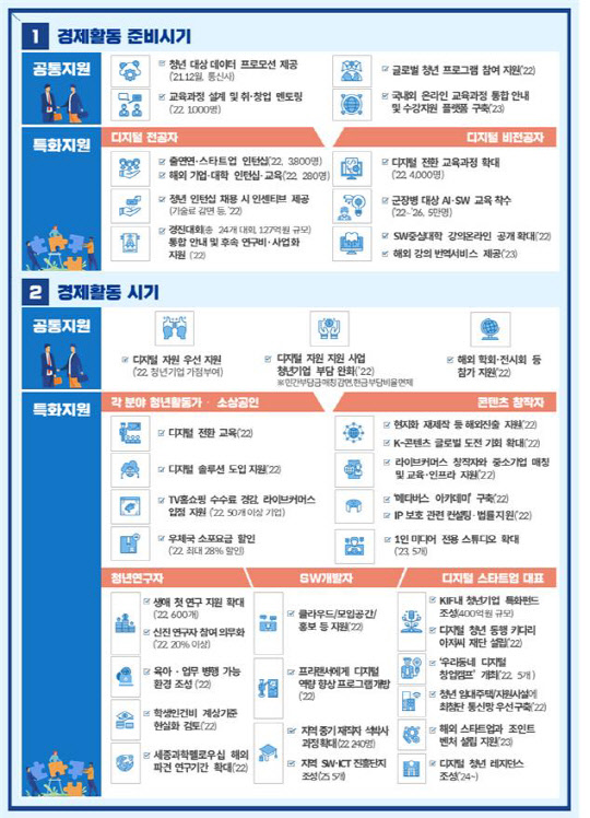 청년 지원정책은 '도전하는 청년, 꿈을 이뤄주는 디지털'이라는 비전 아래 3대 전략, 9개 과제로 추진된다. 먼저 SW 중심대학, 이노베이션 아카데미 등 그간 확충해온 디지털 교육과정을 토대로 전공자와 비전공자, 지역 인재 등을 아우르는 맞춤형 교육과정을 더욱 촘촘히 마련해 취업·창업·창작·연구 등의 다양한 도전기회를 제공한다. 또한 청년들의 성장에 필요한 디지털 자원 제공과 민·관 협력 기반의 지원체계 구축을 추진하고 비디지털 분야 디지털 혁신 지원을 강화한다. 기업의 해외 진출뿐만 아니라 글로벌 스타트업과 인재들을 불러 모으고 교육·인턴십 등 세계무대에서의 다양한 청년활동도 지원한다.