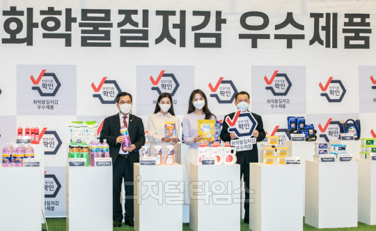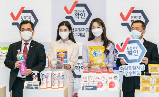 홍정기(왼쪽 첫번째) 환경부 차관과 유제철(오른쪽 첫번째) 한국환경산업기술원장이 14일 서울 중구 대한상공회의소에서 열린 제3기 생활화학제품 안전관리 자발적 협약식에 앞서 모델들과 함께 화학물질 저감 우수제품을 선보이고 있다. 이날 공개된 표백제, 세탁세제, 습기제거제, 살균제 등 총 25개의 제품은 화학물질저감 우수제품 심사위원회의 심사를 통과한 제품으로 화학성분 걱정 없이 사용할 수 있는 생활화학제품이다.