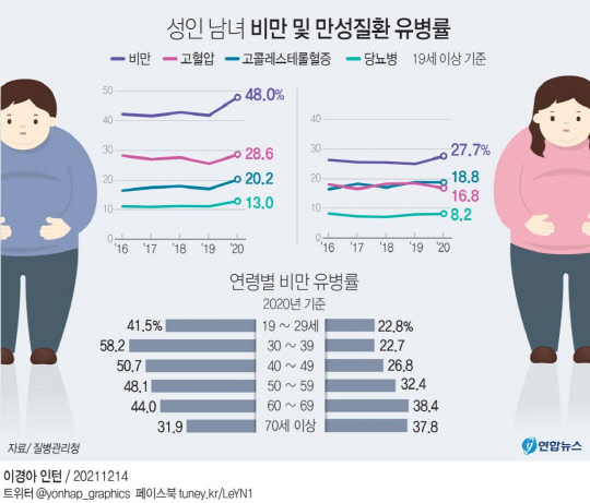조사결과 19세 이상 성인의 비만 유병률이 남녀 모두 증가한 것으로 나타났다. 2019년 41.8%였던 성인 남성 비만 유병률은 지난해 48.0%까지 올라 1998년 시작된 조사 이래 최고치를 기록했다. 연령대별로 보면 특히 30∼40대 남성의 50% 이상이 비만상태인 것으로 조사됐다.