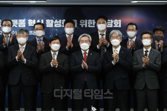 15일 서울 마포구 프론트원에서 열린 '금융플랫폼 혁신 활성화를 위한 간담회'에서 고승범 금융위원장 등 참석자들이 기념촬영을 하고 있다.