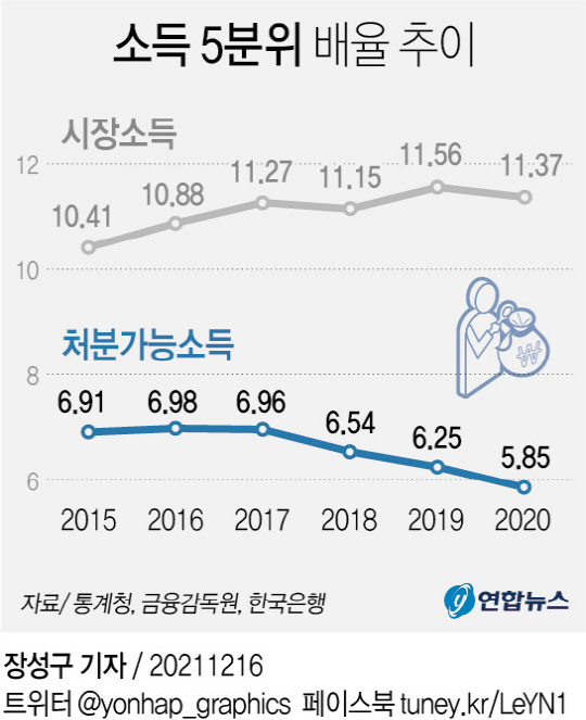 통계청·금융감독원·한국은행이 16일 발표한 '2021년 가계금융복지조사' 결과에 따르면 2020년 기준 균등화 처분가능소득 5분위 배율은 5.85배로 집계됐다. 지난해 상위 20% 계층(5분위)의 소득이 하위 20% 계층(1분위)의 5.8배 수준이라는 것이다. 이 배율은 2019년 6.25배에서 0.40배포인트 줄며 개선 흐름을 보였다.
