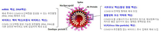이 가운데 바이러스 벡터 백신의 경우 영국 아스트라제네카, 미국 얀센, 중국 칸시노, 한국 셀리드 등, 합성항원 백신은 미국 노바백스, 사노피 파스퇴르-GSK, 중국, 러시아, 한국 SK바이오사이언스·유바이오로직스 등, 자가증식 RNA 백신은 미국 엘릭시젠 테라퓨틱스, 영국 임페리얼 칼리지 런던, 영국 글락소스미스클라인(GSK), 한국 큐라티스 등, DNA 백신은 인도 자이더스 캐딜라(Zydus Cadila), 미국 이노비오, 한국 제넥신·진원생명과학 등이 각각 글로벌 임상을 진행하고 있다.