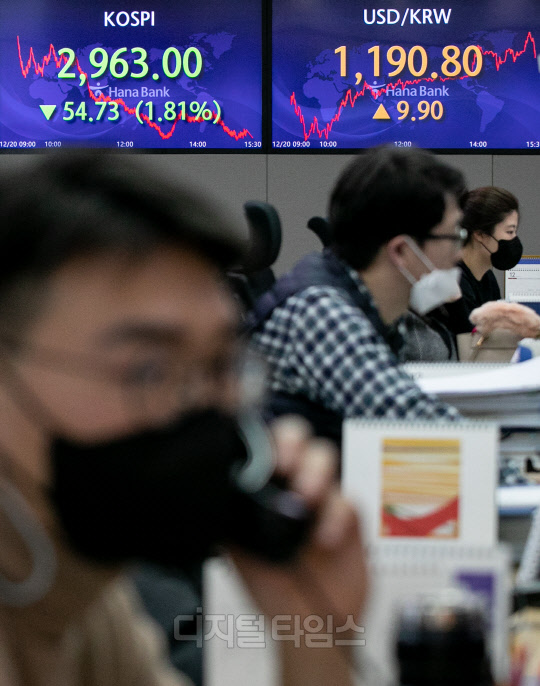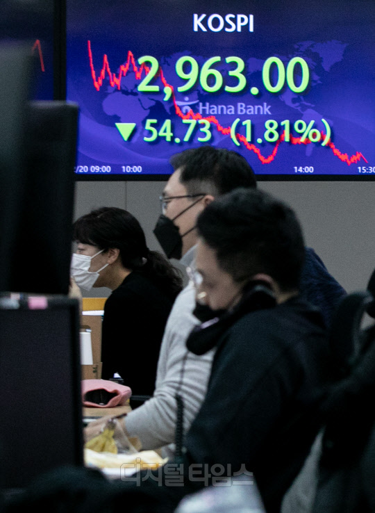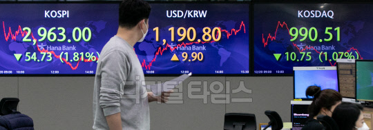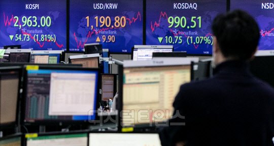 코스피가 전 거래일 대비 54.73포인트 하락한 2,963.00로 장을 마친 20일 서울 중구 하나은행 딜링룸에서 직원들이 분주히 업무를 보고 있다. 이날 코스닥은 10.75포인트 하락한 990.51, 원·달러 환율은 9.9원 오른 1190.8원으로 마감했다.
