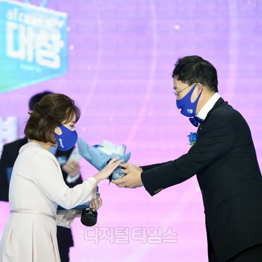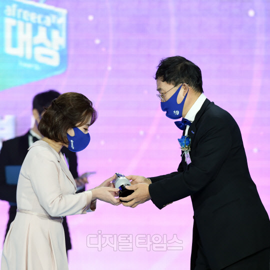BJ 윤서야!(본명 김소희)이 24일 서울시 서초구 aT센터에서 진행된 'NH콕뱅크와 함께하는 2021 아프리카TV BJ대상'에서 특별상을 수상, 서수길 아프리카TV 전 대표-현 CBO에게 트로피를 전달받은 후 소감을 전하고 있다.