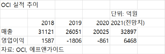 27일 금융정보 제공업체 에프앤가이드 컨센서스(전망치 평균)에 따르면 OCI의 올해 연간 매출은 3조2897억원, 영업이익은 6468억원으로 추정된다. 올해 OCI의 연간 실적은 10년만에 최고치를 기록할 전망이다. 기존 최대 실적은 폴리실리콘 사업 호황기인 지난 2011년에 기록한 매출 4조2759억원, 영업이익 1조1179억원이다.