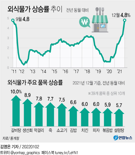 지난해 외식물가는 연간 2.8% 상승했다. 2018년(3.0%) 이후 최고 상승률이다. 12월 외식물가 상승률은 4.8%로, 2011년 9월(4.8%) 이후 10년 3개월 만에 가장 높은 수준을 기록했다. 갈비탕(10.0%), 생선회(8.9%), 막걸리(7.8%), 죽(7.7%), 소고기(7.5%), 김밥(6.6%), 치킨(6.0%), 피자(6.0%), 볶음밥(5.9%), 설렁탕(5.7%) 순으로 상승률이 높았다. 돼지갈비(5.6%), 짜장면(5.5%), 라면(5.5%), 삼겹살(5.3%), 냉면(5.3%), 햄버거(5.2%), 비빔밥(5.0%), 짬뽕(5.0%), 돈가스(4.9%) 등도 전체 외식물가 상승률을 웃돌았다.