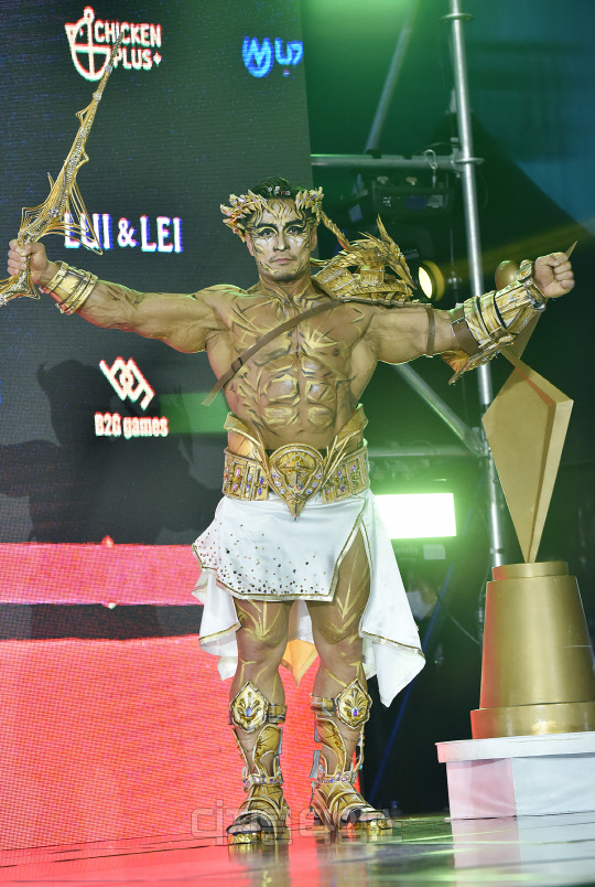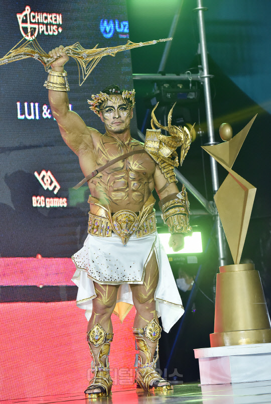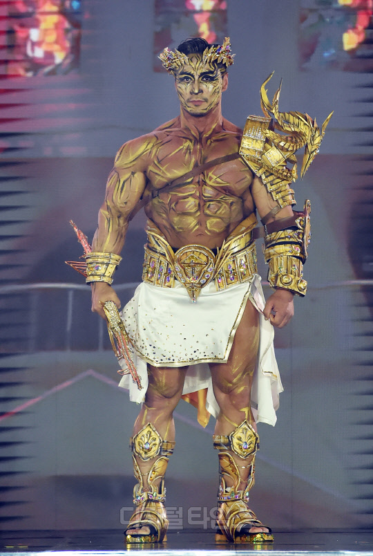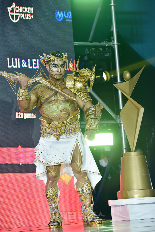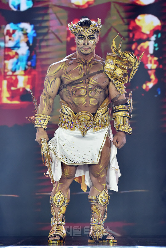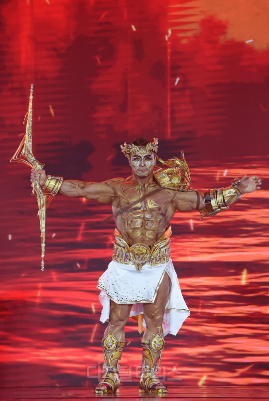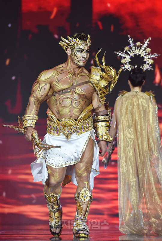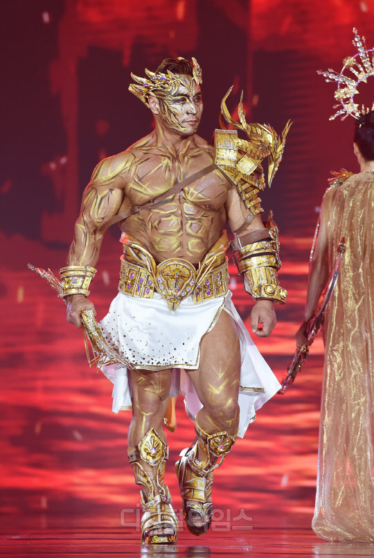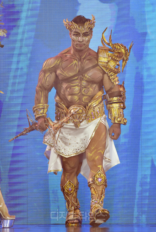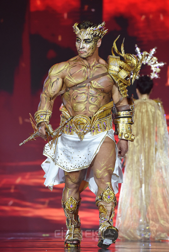 전 국가대표 보디빌더 최재덕이 서울시 강남구 SETEC에서 열린 '제16회 우즈넥스와 함께 하는 코리아에이치투얼라이언스 아시아모델어워즈(KOREA H2 ALLIANCE 2021 ASIA MODEL AWARDS with UZNEX)'의 뷰티 피트니스 갈라쇼에서 당당한 워킹을 선보이고 있다.