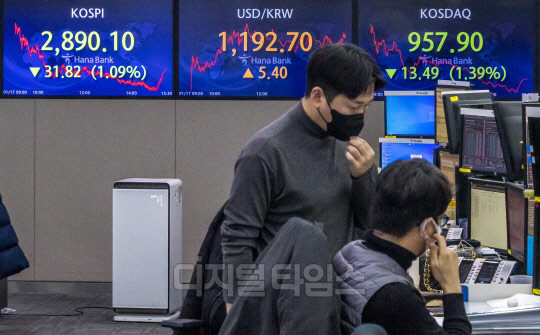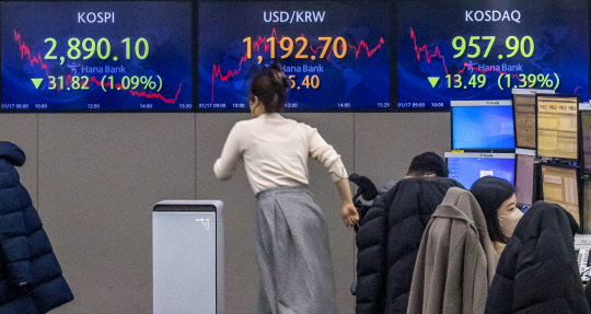 코스피가 전 거래일 대비 31.82포인트 하락한 2890.10으로 장을 마쳐 한달 여만에 2900선 밑으로 내려간 17일 서울 중구 하나은행 딜링룸에서 직원들이 분주히 업무를 보고 있다. 이날 코스닥은 13.49포인트 하락한 957.90, 원·달러 환율은 5.4원 오른 1192.7원으로 마감했다.