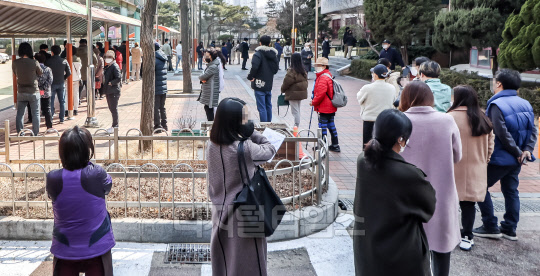 20대 대통령 선거일인 9일 서울 서대문구 홍제초등학교에 마련된 투표소에서 시민들이 투표를 하기 위해 줄을 서서 기다리고 있다.