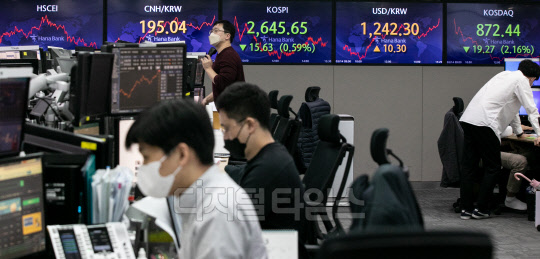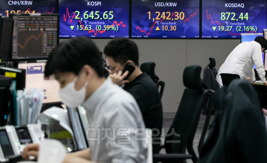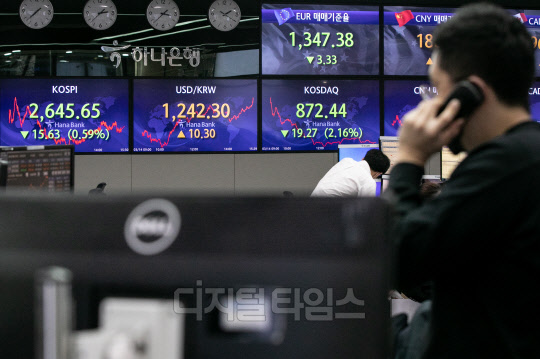 원·달러 환율이 전 거래일보다 10.3원 오른 1242.3원으로 장을 마쳐 1년 10개월 만에 최고치를 기록한 14일 서울 중구 하나은행 딜링룸에서 직원들이 분주히 업무를 보고 있다. 이날 코스피는 15.63포인트 하락한 2645.65, 코스닥은 19.27포인트 하락한 872.44로 마감했다.