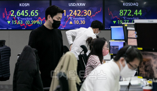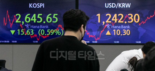 원·달러 환율이 전 거래일보다 10.3원 오른 1242.3원으로 장을 마쳐 1년 10개월 만에 최고치를 기록한 14일 서울 중구 하나은행 딜링룸에서 직원들이 분주히 업무를 보고 있다. 이날 코스피는 15.63포인트 하락한 2645.65, 코스닥은 19.27포인트 하락한 872.44로 마감했다.