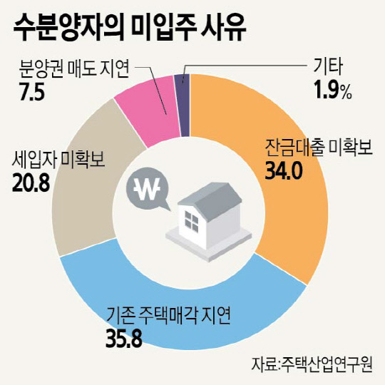 이유를 살펴보면, '기존주택 매각 지연'으로 인한 미입주 가구 비중이 35.8%로 가장 높았다. '잔금대출 미확보'(34.0%)와 '세입자 미확보'(20.8%), '분양권 매도 지연'(7.5%) 등이 뒤를 이었다. '잔금대출 미확보'로 인한 미입주 가구의 비중은 전달보다 소폭 하락했으나, 여전히 예년에 비해 높은 수준이다.