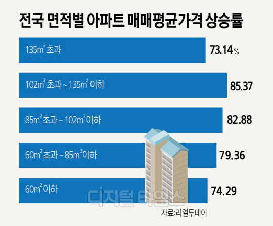 업계 관계자는 "건설사가 소형, 중소형 위주로 아파트를 공급하다 보니 중대형 면적의 물량이 상대적으로 적었다"며 "공급 물량이 적은 중대형 면적의 희소성이 부각되며 가격 상승폭이 커진 것으로 판단된다"고 전했다.