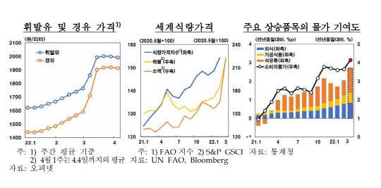 올해 유가 수준에 대해서는 지난 2월 물가전망 당시 전제했던 올해 연평균 유가 수준(83달러, 유바이이유 기준)을 큰 폭으로 웃돌 것으로 전망했다.