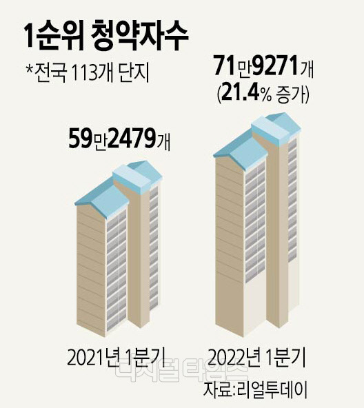 6일 부동산 전문 리서치업체 리얼투데이가 한국부동산원 청약홈을 분석한 결과에 따르면 지난 올해 1~3월 전국 113개 단지에 71만9271개의 1순위 청약통장(민간 사전청약 포함)이 접수됐다. 지난해 같은 기간 59만2479개(88개 단지)보다 21.4%가 늘었다.