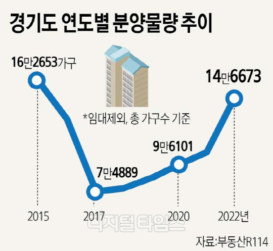 6일 부동산R114에 따르면 올해 경기도에서 분양 예정 단지는 총 14만6673가구(임대 제외, 총 가구수 기준)로 지난해 10만5420가구보다 약 39.13% 늘었다. 역대 최대 분양 물량인 2015년 16만2653가구에 이어 두 번째로 많은 규모다.