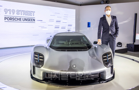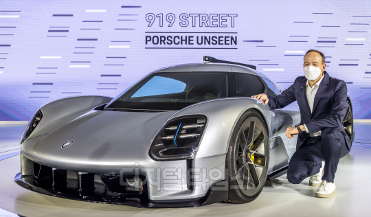 홀가 게어만 포르쉐코리아 대표가 8일 서울 동대문디자인플라자(DDP)에서 열린 '포르쉐 이코넨, 서울-스포츠카 레전드' 전시에서 고성능 하이퍼 콘셉트 모델 '919 스트리트'와 함께 포즈를 취하고 있다. 포르쉐가 아시아 최초로 진행하는 이번 행사에서는 헤리티지, 모터스포츠, 이노베이션 등의 테마로 구성된 공간에 아시아 최초 공개되는 '919스트리트'를 포함해 양산 차량, 레이싱카, 콘셉트 차량 등 18대의 스포츠카를 선보인다.