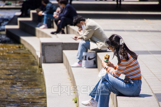 실외 마스크 착용 의무화 해제 첫 날인 2일 서울 중구 청계천에서 직장인들이 마스크를 벗고 휴식을 취하고 있다.