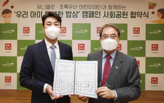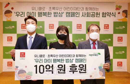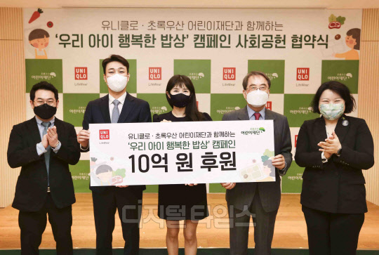 6일 서울 중구 초록우산어린이재단에서 열린 '유니클로-초록우산 어린이재단과 함께하는 우리 아이 행복한 밥상 캠페인 사회공헌 협약식'에서 정현석 에프알엘코리아 공동대표, 김경란 초록우산 어린이재단 홍보대사, 이제훈 초록우산 어린이재단 회장 등 참석자들이 기념촬영을 하고 있다. <사진제공=초록우산어린이재단>