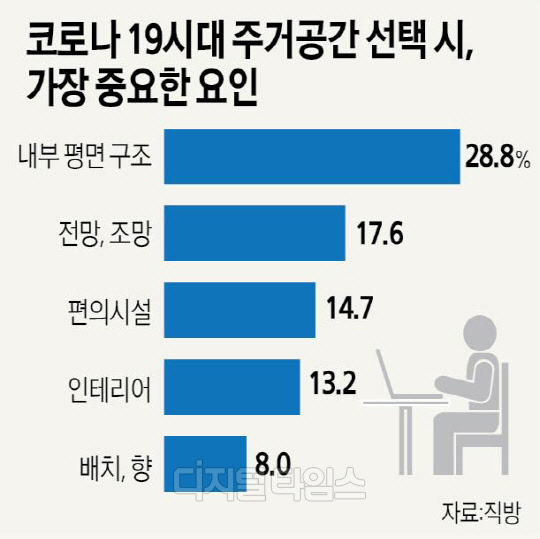 코로나19 시기에 주거공간을 선택할 때 가장 중요하게 생각하는 요인은 '내부 평면 구조'가 28.8%로 가장 많았다. 이어 전망·조망(17.6%), 편의시설(14.7%), 인테리어(13.2%), 배치·향(8.0%) 등의 순이었다. 20~30대와 40대 이상 모두 '내부 평면 구조'를 가장 중요한 요인으로 봤으나 2순위는 연령대별로 차이를 보였다. 20~30대는 '편의시설'(23.2%) 두 번째 중요 요인으로 꼽았고, 40대 이상은 '전망·조망'(18.5%)을 선택했다.