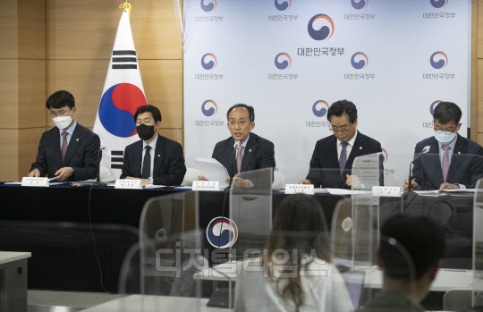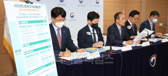 추경호 경제부총리 겸 기획재정부 장관이 12일 서울 종로구 정부서울청사에서 '22년 2차 추가경정예산안' 관계장관 합동브리핑을 하고 있다. 왼쪽부터 조주현 중소벤처기업부 차관, 최상대 기획재정부 2차관, 추 부총리, 정황근 농림축산식품부 장관, 조규홍 보건복지부 1차관.
