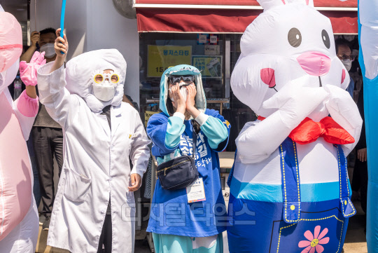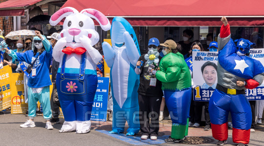 인형옷을 입은 지지자 등이 23일 서울 동작구 남성역골목시장에서 송영길 더불어민주당 서울시장 후보의 선거 유세를 보고 있다.