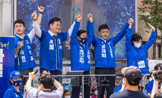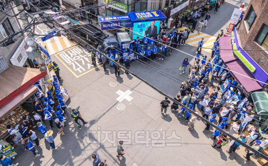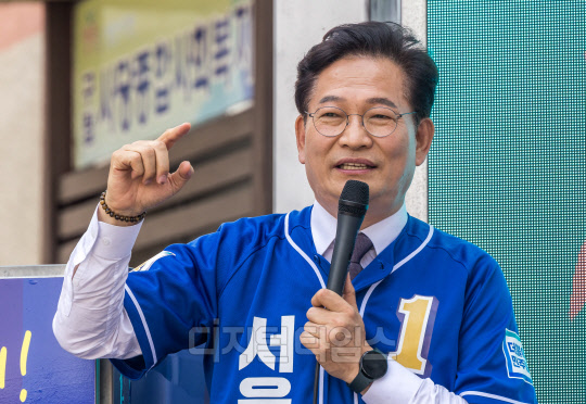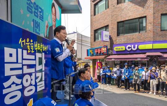 송영길 더불어민주당 서울시장 후보가 23일 서울 동작구 남성역골목시장에서 선거 유세를 하고 있다.