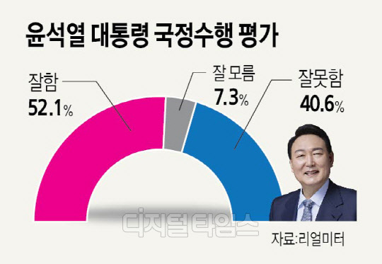 윤석열 대통령이 취임 후 첫 국정수행 평가 조사에서 긍정평가 52.1%, 부정평가 40.6%를 기록했다.