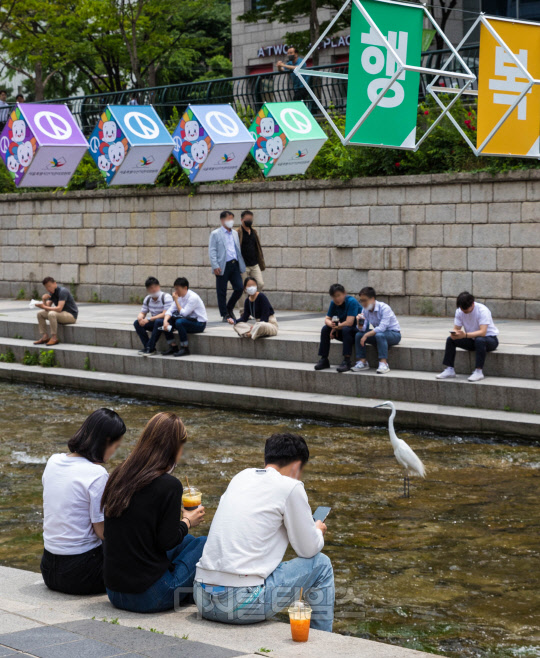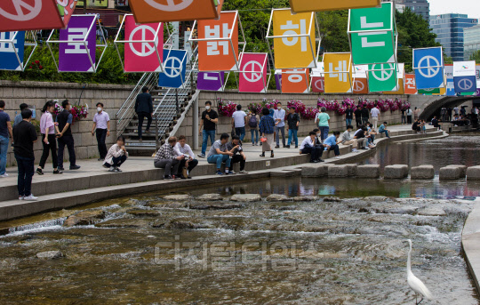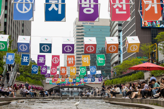 제8회 전국동시지방선거를 일주일 앞둔 25일 서울 중구 청계천 모전교 일대에 서울시 선관위에서 설치한 선거 투표 참여 독려 홍보 조형물이 걸려 있다.