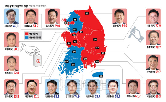 광역단체장, 국민의힘 13·민주당 4 우세 서울 오세훈 55%·인천 유정복 53% 당선 유력 민주, 호남·제주서만 우위… 경기 김은혜 50%