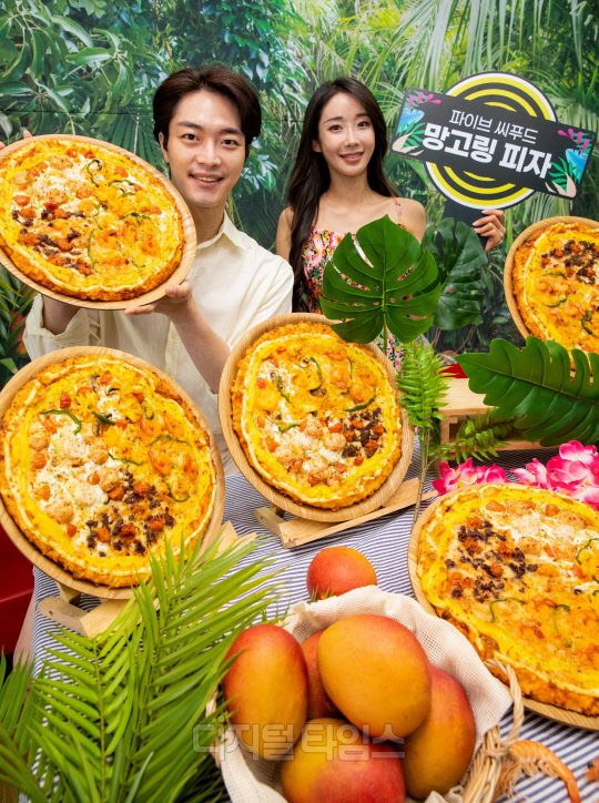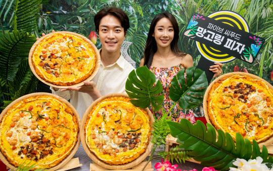 8일 서울 중구 도미노피자 명동점에서 모델들이 도미노피자 신제품 '파이브 씨푸드 망고링 피자'를 홍보하고 있다. '파이브 씨푸드 망고링 피자'는 붉은대게살, 관자살, 새우, 랍스터볼, 플라워 스퀴드 등 5가지 씨푸드 토핑을 통해 다채로운 맛을 즐길 수 있도록 한 제품이다.