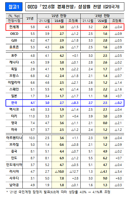 OECD는 우크라이나 사태 장기화, 중국의 주요도시 봉쇄 등 여파로 세계경제 회복세가 둔화하고, 물가는 큰 폭 상승할 것으로 예상했다. OECD의 세계경제 성장률 전망치는 올해 3.0%, 내년 2.8%다. 종전 전망 대비 각각 1.5%포인트, 0.4%포인트 하락한 수치다.