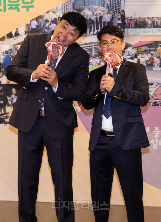 육우자조금관리위원회 조재성 관리위원장과 홍보대사 양준혁 양준혁야구재단 이사장이 9일 서울 여의도 글래드 호텔에서 열린 '2022 육우데이 기념행사' 포토월에서 포즈를 취하고 있다.
