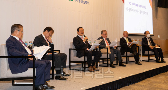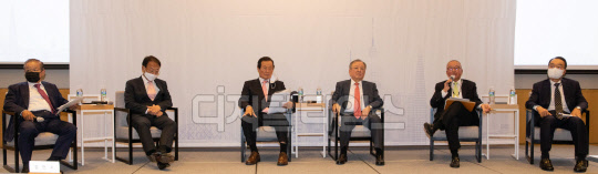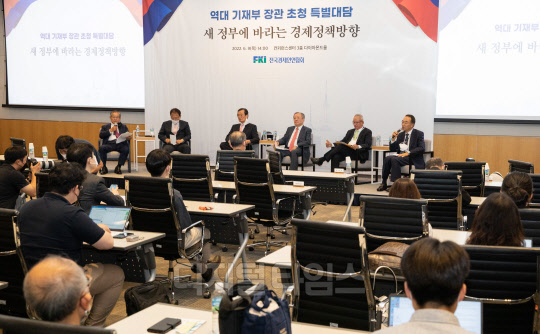 9일 서울 영등포구 전경련 컨퍼런스센터에서 '새 정부에 바라는 경제정책방향'을 주제로 열린 역대 기재부 장관 초청 특별대담에 참석한 패널들이 의견을 나누고 있다. 왼쪽부터 권태신 전경련 상근부회장, 유일호, 윤증현, 강만수, 현오석, 박재완 전 장관.