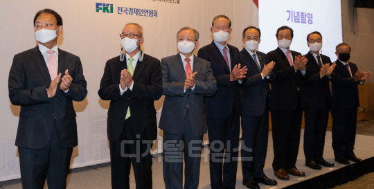 추경호 경제부총리 겸 기획재정부 장관과 허창수 전경련 회장이 9일 서울 영등포구 전경련 컨퍼런스센터에서 '새 정부에 바라는 경제정책방향'을 주제로 열린 역대 기재부 장관 초청 특별대담에 앞서 패널들과 함께 기념 촬영을 하고 있다. 왼쪽부터 유일호, 현오석, 강만수 전 장관, 허창수 회장, 추경호 부총리, 윤증현, 박재완 전 장관, 권태신 전경련 상근부회장.