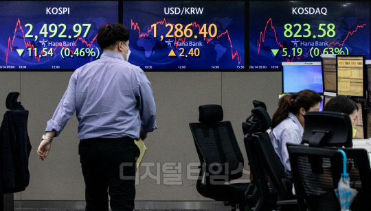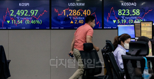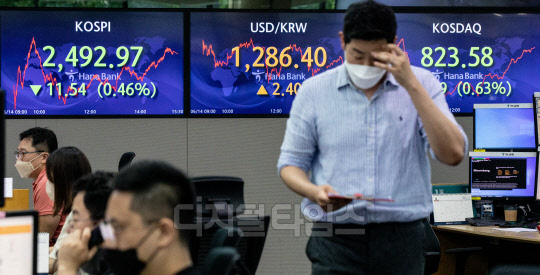 코스피가 전 거래일보다 11.54포인트 내린 2492.97으로 장을 마쳐 1년 7개월 만에 2500선이 붕괴된 14일 서울 중구 하나은행 딜링룸에서 직원들이 분주히 업무를 보고 있다. 이날 코스닥은 5.19포인트 내린 823.58, 원·달러 환율은 2.4원 오른 1286.4원으로 마감했다.